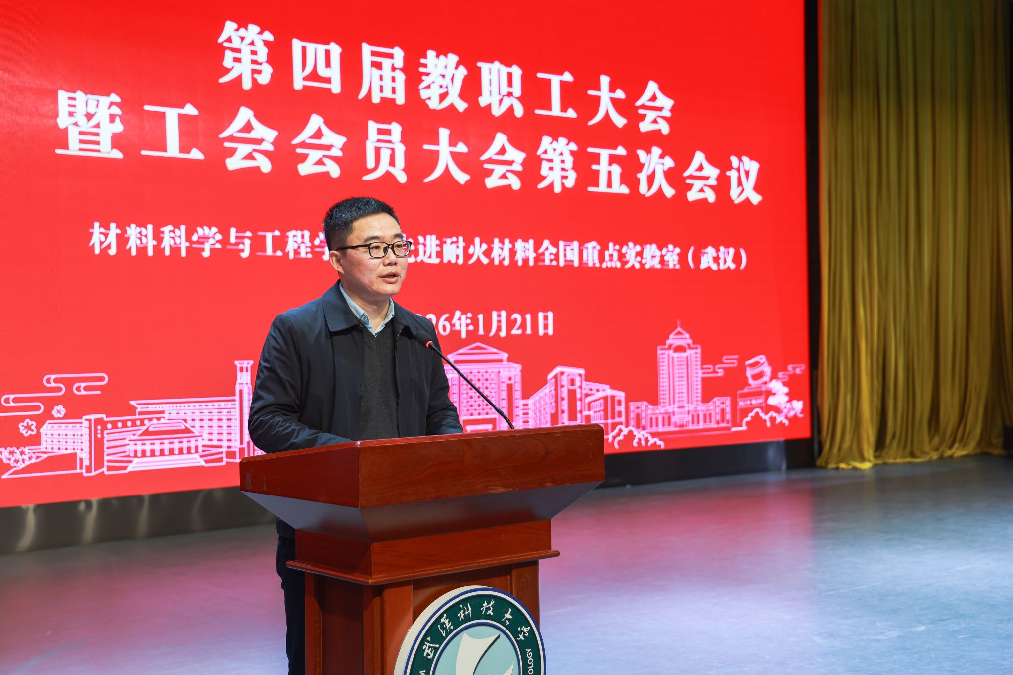 (通讯员叶显伟)1月21日下午,材料科学与工程学院第四届教职工大会暨工会会员大会第五次会议在青山校区碧园会堂举行。会议紧密围绕学校三届八次、三届九次全委会(扩大)会议和五届四次教职工暨工会会员代表大会精神,系统总结2025年工作成效,全面部署2026年重点任务,隆重表彰为学科建设作出卓越贡献的团队和个人。院长李享成代表学院作工作报告,工会主席、副院长韩兵强作工会工作报告。党委书记刘帅主持会议。