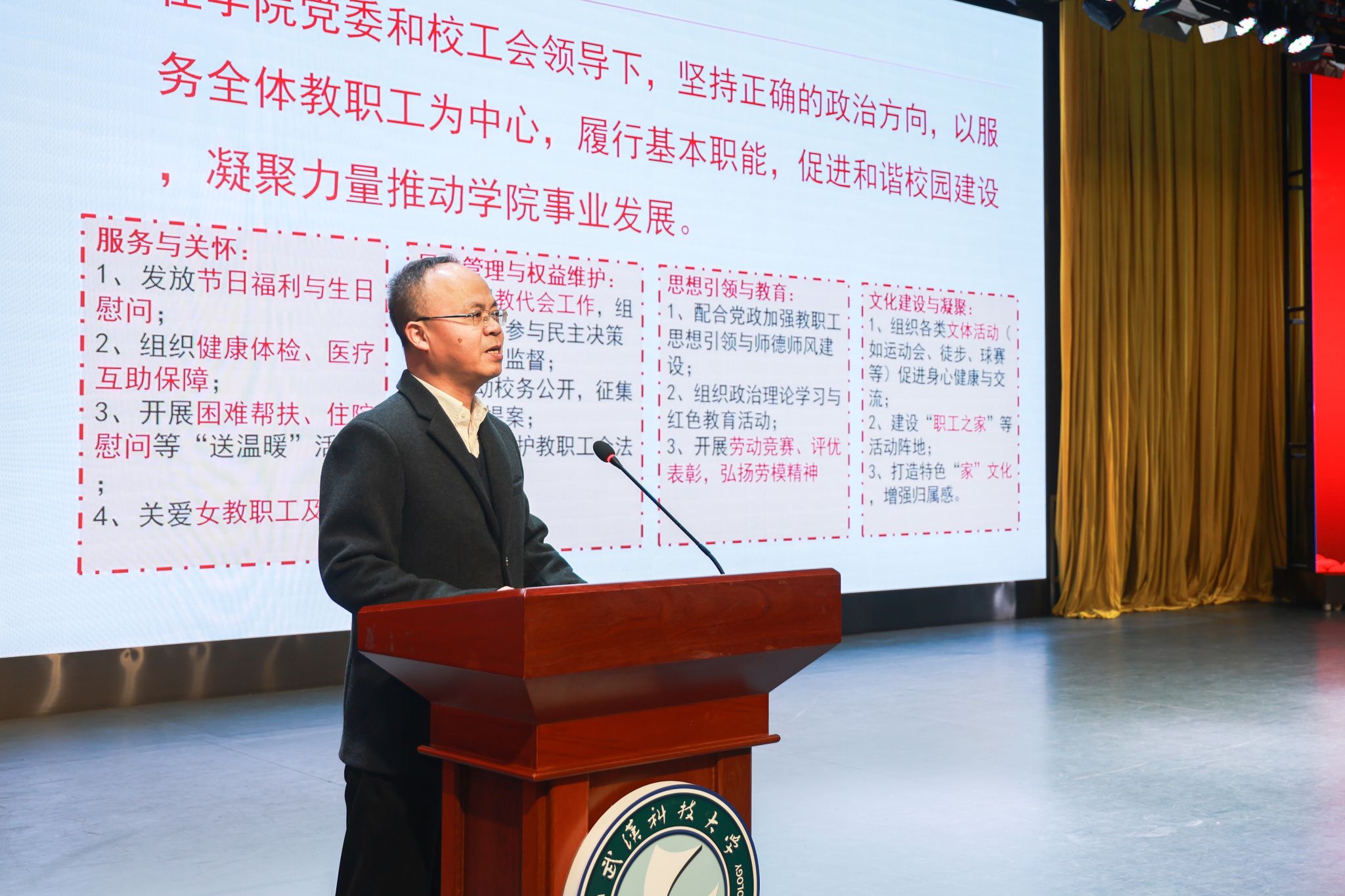 学院工会主席、副院长韩兵强作工会工作报告。他从强化思想引领、深化民主管理、丰富职工生活、解决急难愁盼等方面回顾了工会一年来的履职情况。他表示,新的一年工会将重点推进“职工小家”建设,做好教代会换届选举及提案工作,致力建设更有力量、更有温度的工会组织。